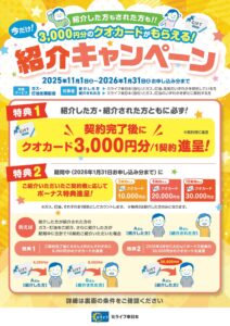紹介した方へ、キャンペーン期間中(2026年1月31日(土)お申し込み分まで)にご紹介いただいたご契約数に応じて、さらに最大30,000円分のQUO(クオ)カードを「ボーナス特典」として進呈