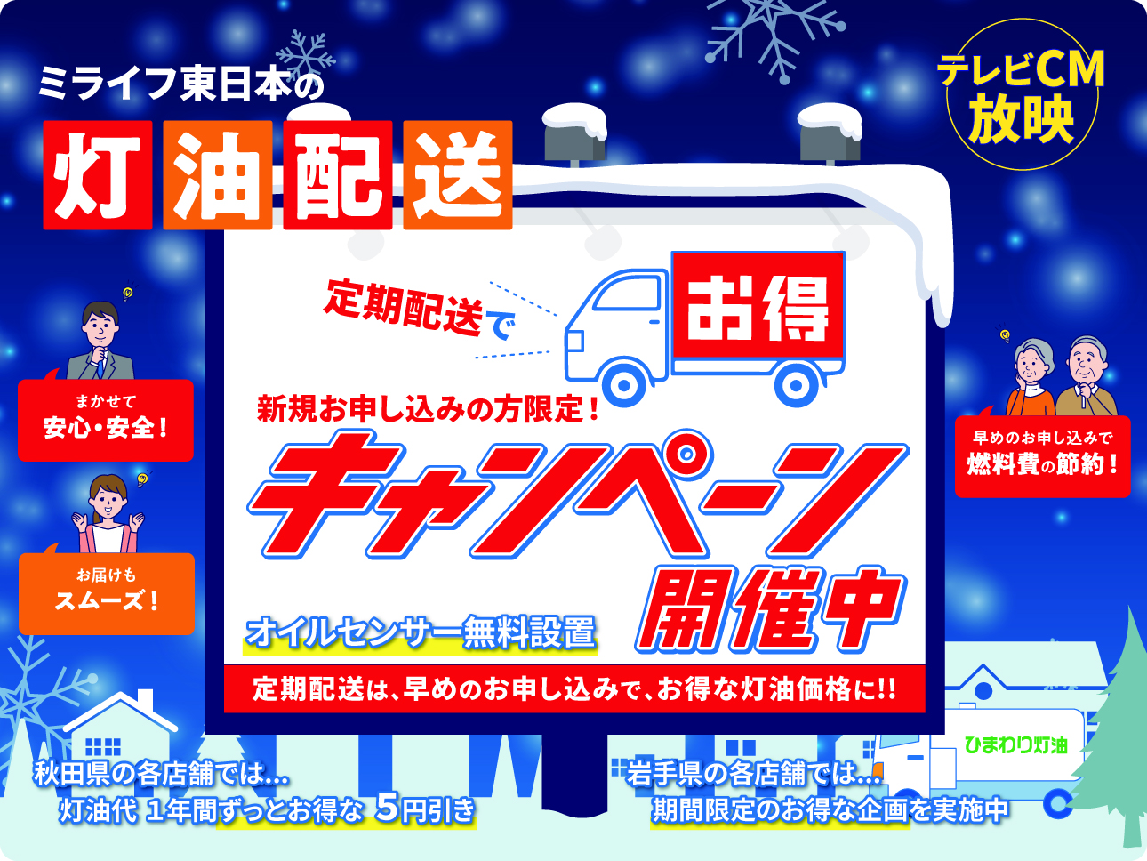 秋田県と岩手県にあるミライフ東日本の各店舗で、灯油の定期配送の新規お申し込みでお得な価格になるキャンペーンなどを実施しています。
