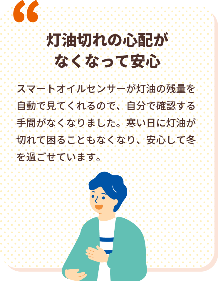 ご自宅で使用中のオイルタンクの灯油残量をセンサーで自動管理します。設置費用の負担なく、工事不要で、灯油タンクのキャップを変えるだけで簡単に導入できます。