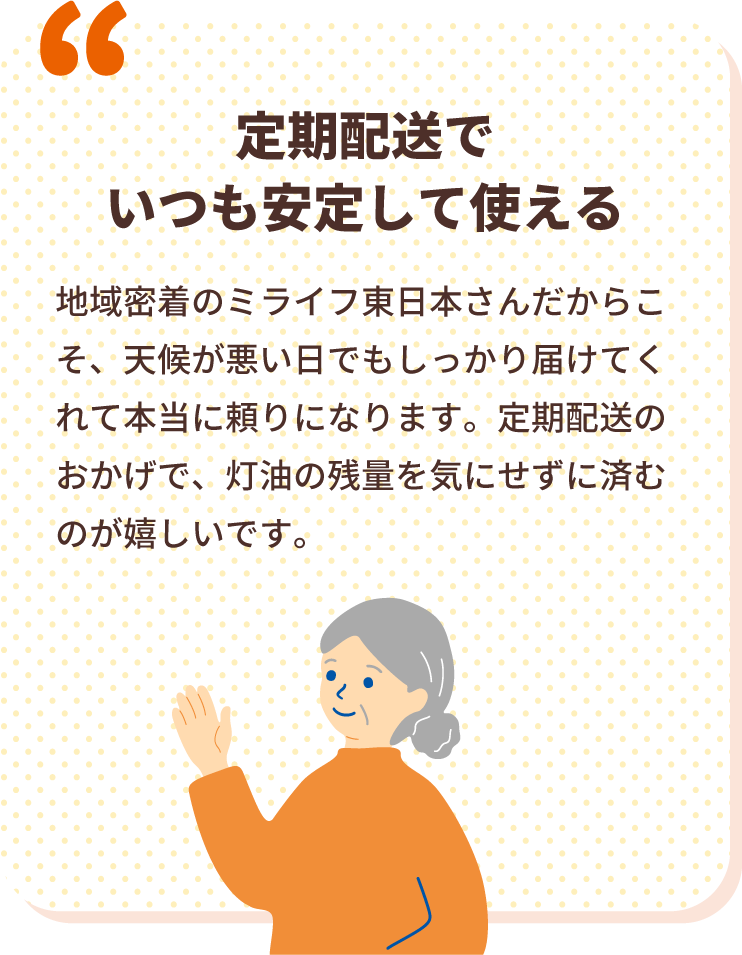 留守中でも安心!定期的に配送されるため、灯油が切れる心配がなくなります。留守中でも給油可能ですので安心です。